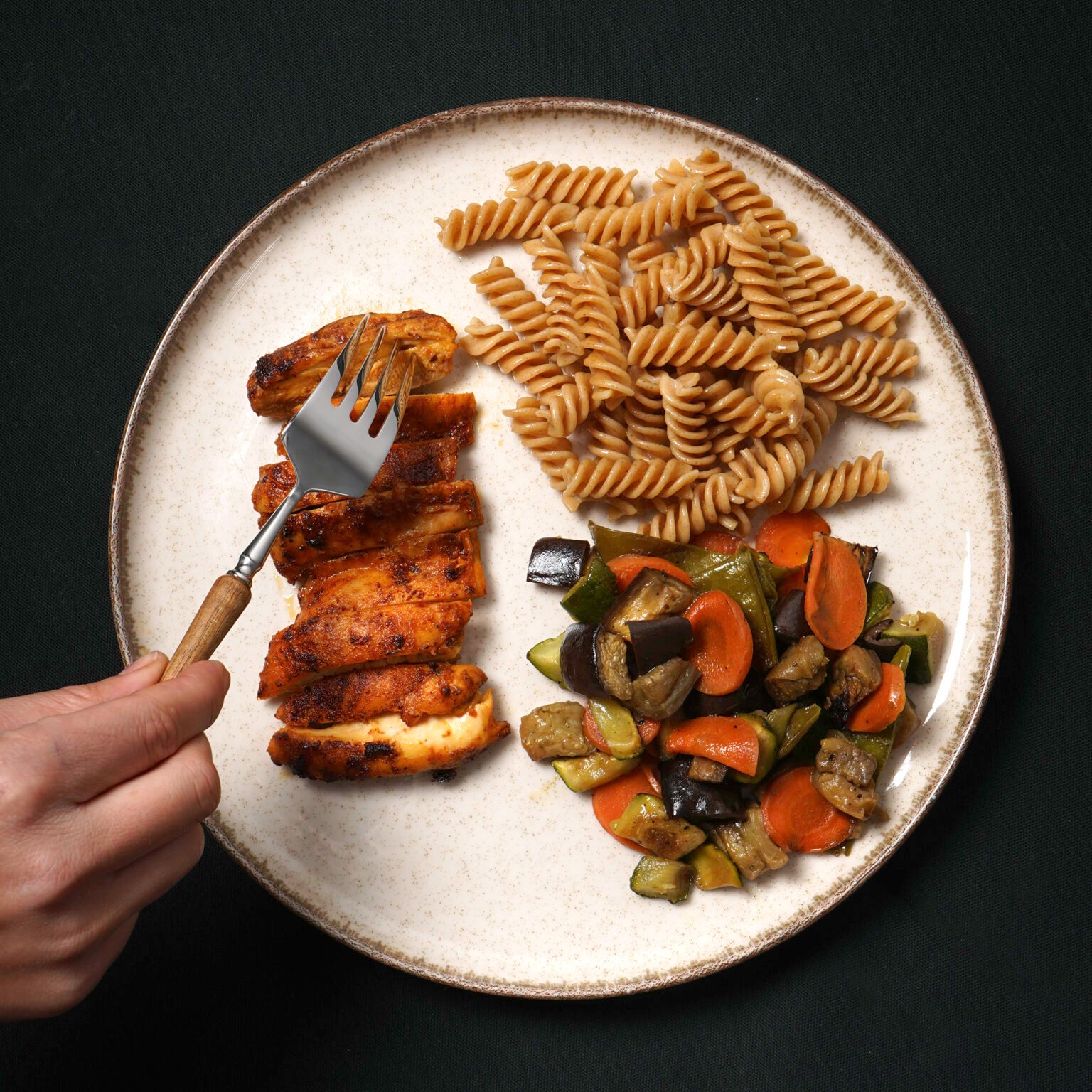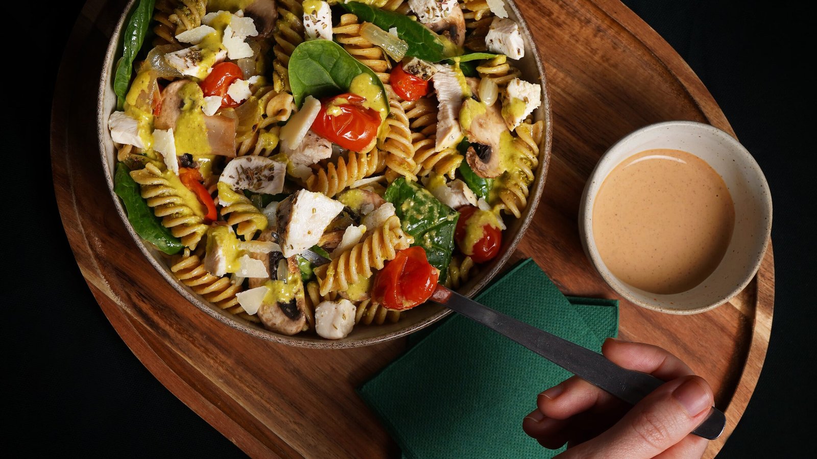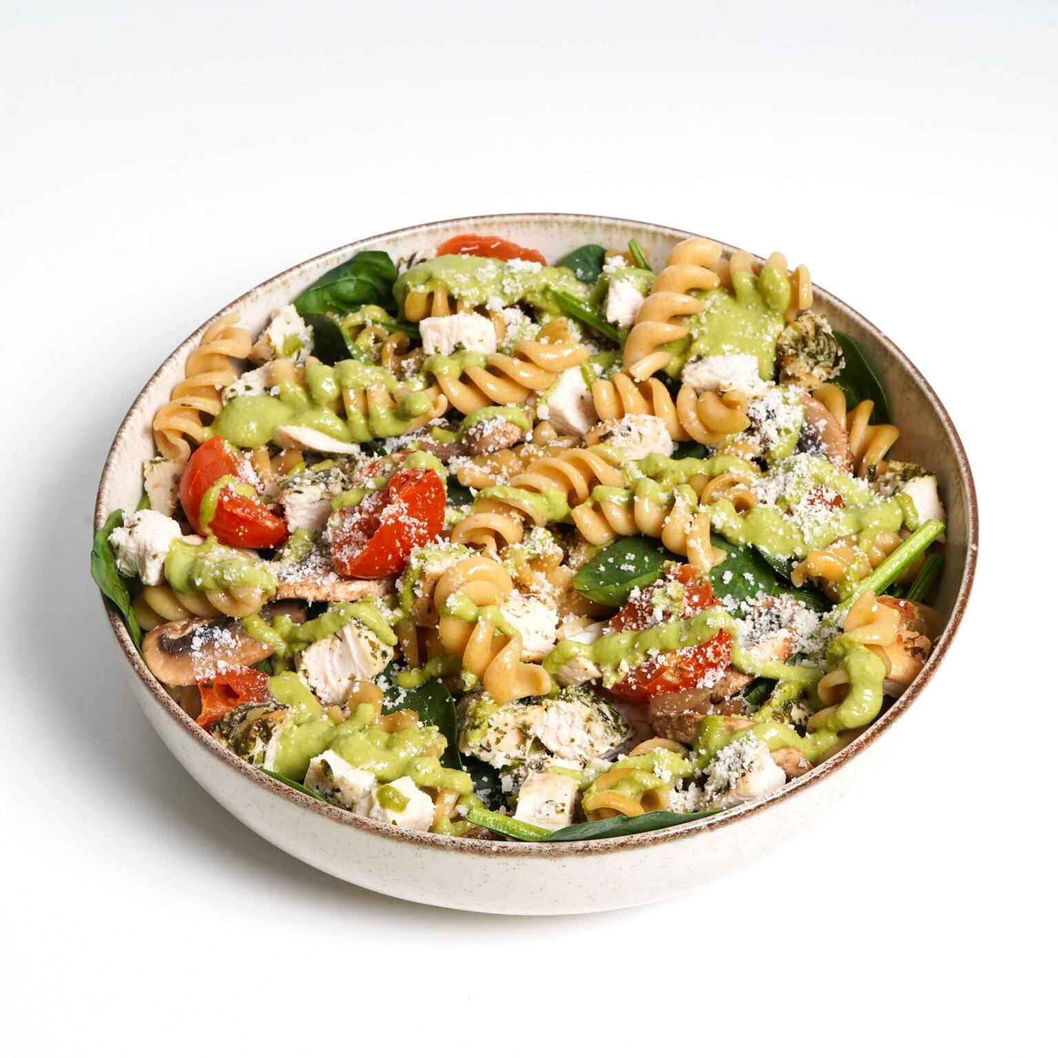 Pasta fusili integral con pesto de anacardos casero, dados de pollo certificado horneado a las finas hierbas, cherries, champiñones y cebolla asados, espinaca baby, queso parmesano y nuestra salsa de pesto Habituals rica en grasas saludables.