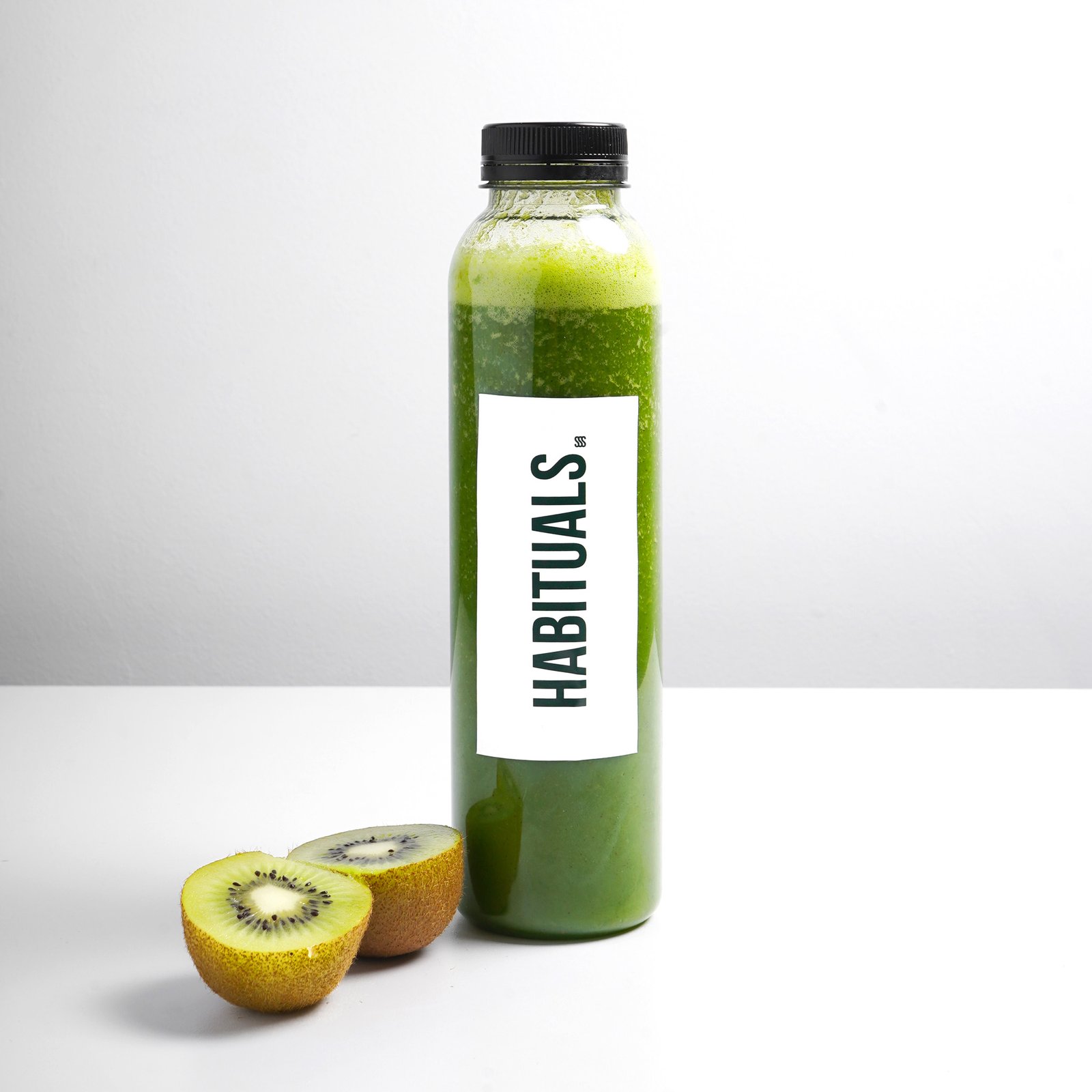 Zumo verde de kiwi, piña, espinaca, jengibre, limón y apio hecho al momento.