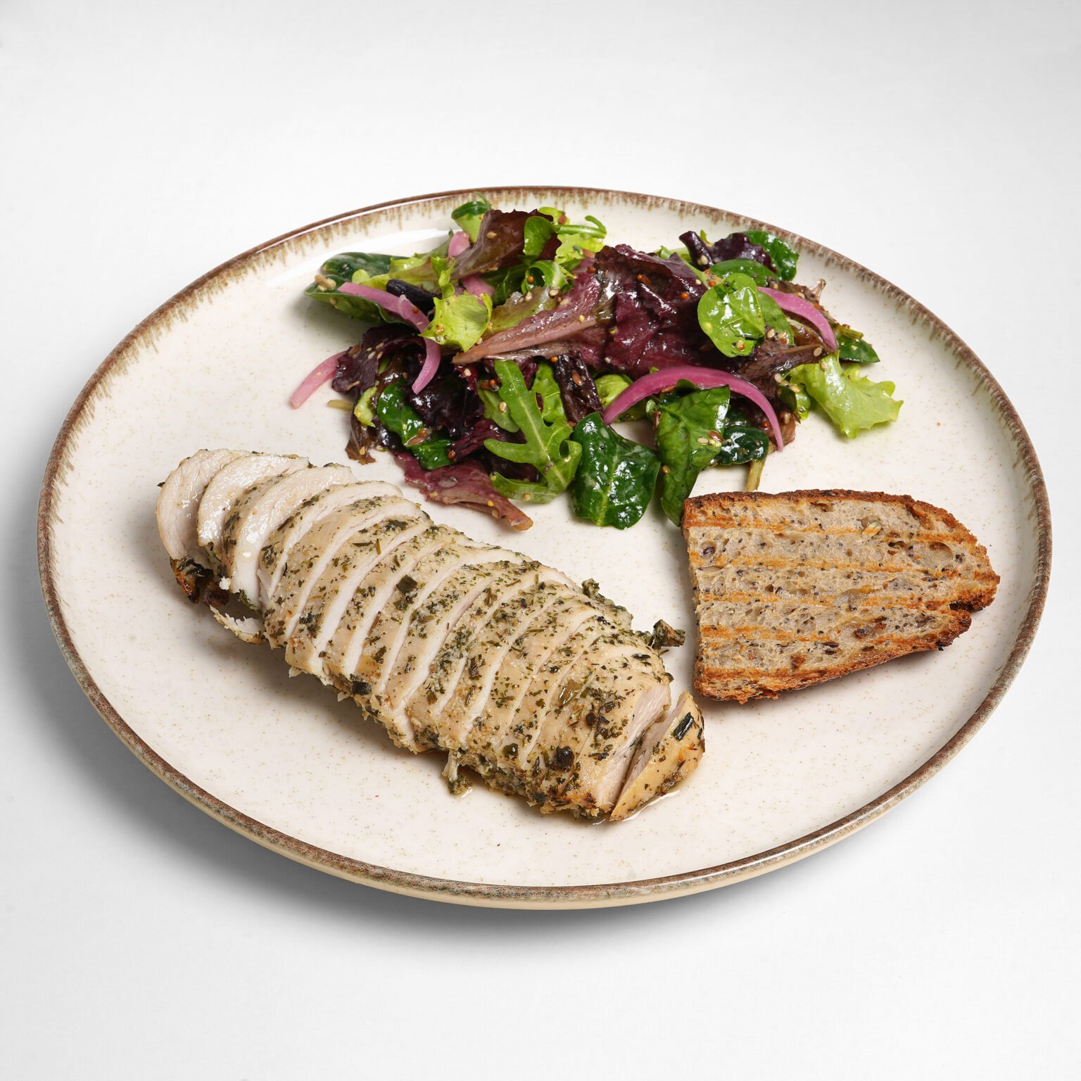 Pechuga de pollo ecológico marinada a las finas hierbas, sellada y cocinada al horno conservando sus jugos. 140 g.