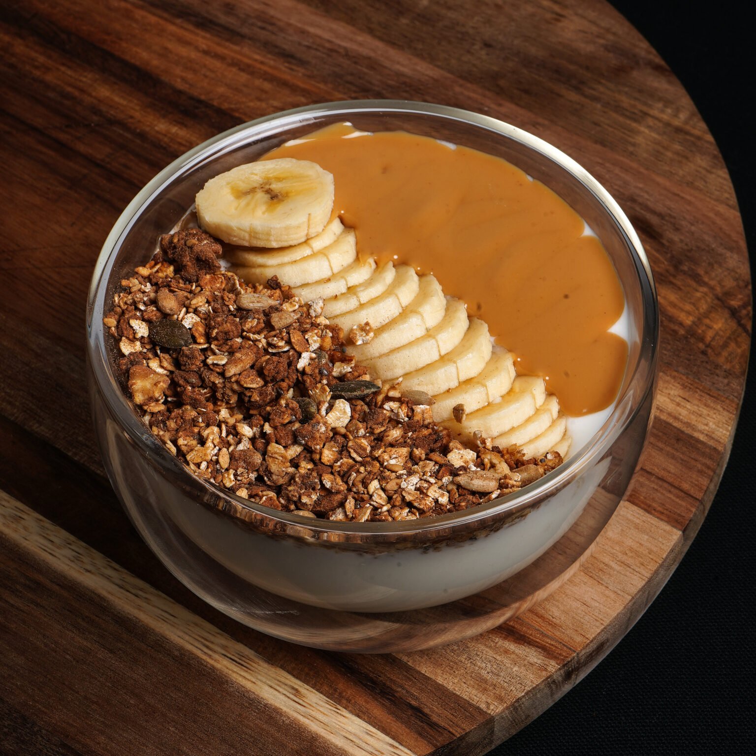 Kéfir cremoso by "La Ermita" con plátano, granola Habituals (hecha con avena, chía, mix de semillas, anacardos, nueces y miel) y crema de cacahuete.