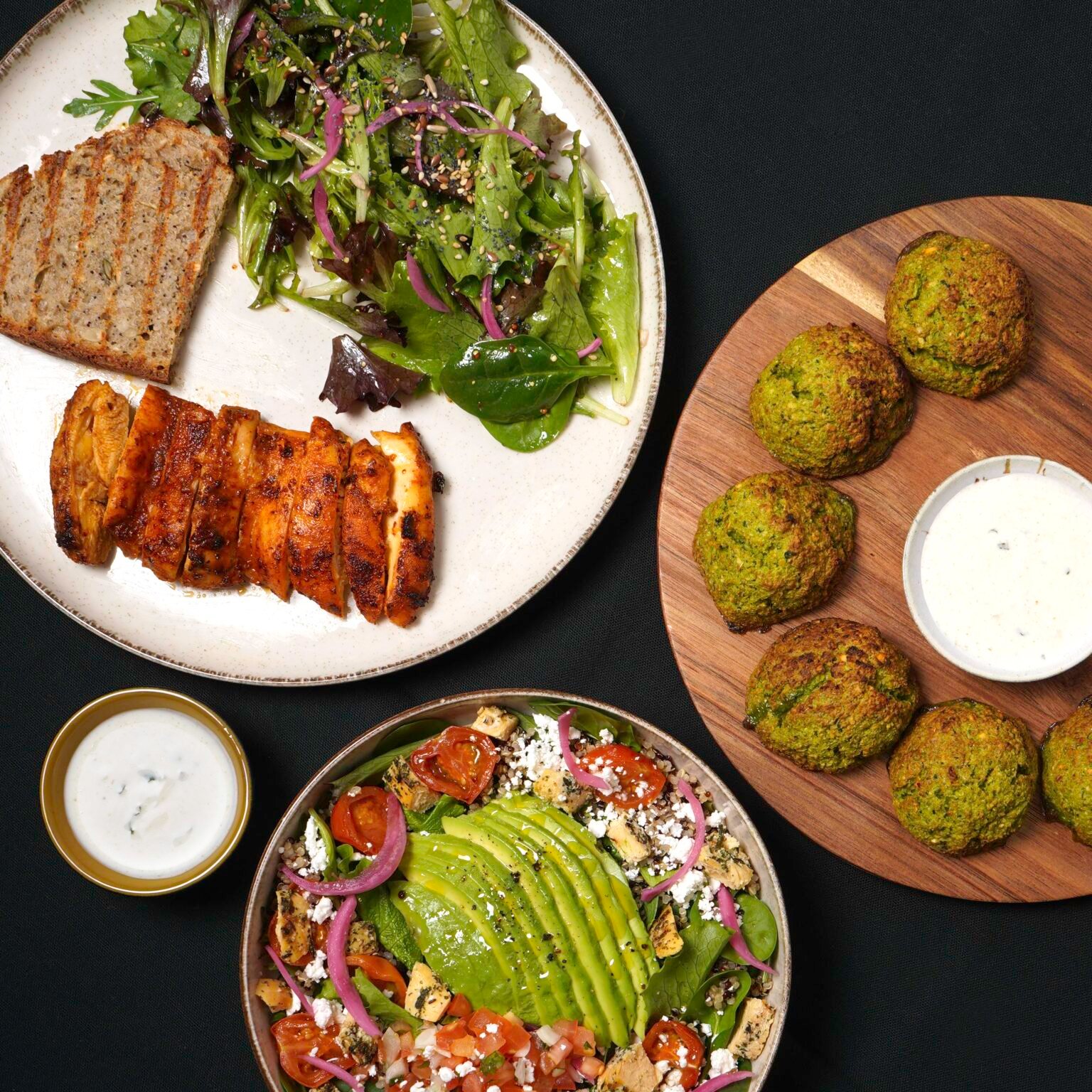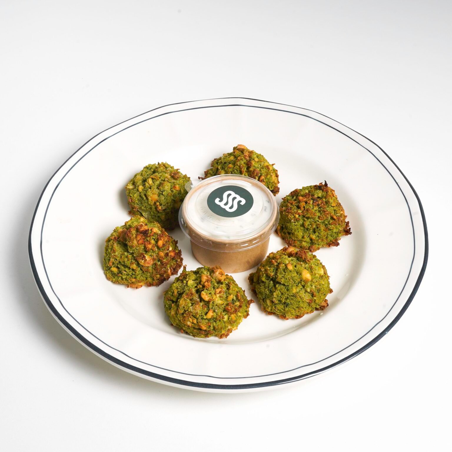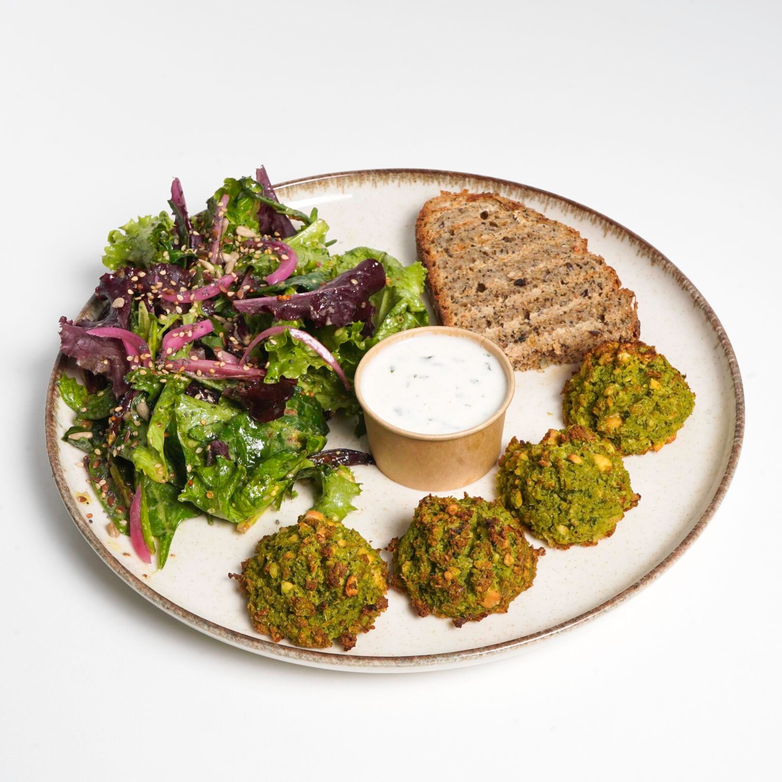 Bolitas de falafel casero al horno, elaboradas a base de garbanzo, espinaca, cebolla, ajo, comino, perejil, cilantro, sal y pimienta, acompañadas con salsa de kéfir Habituals.