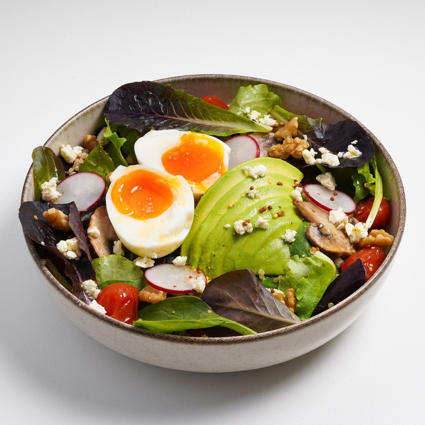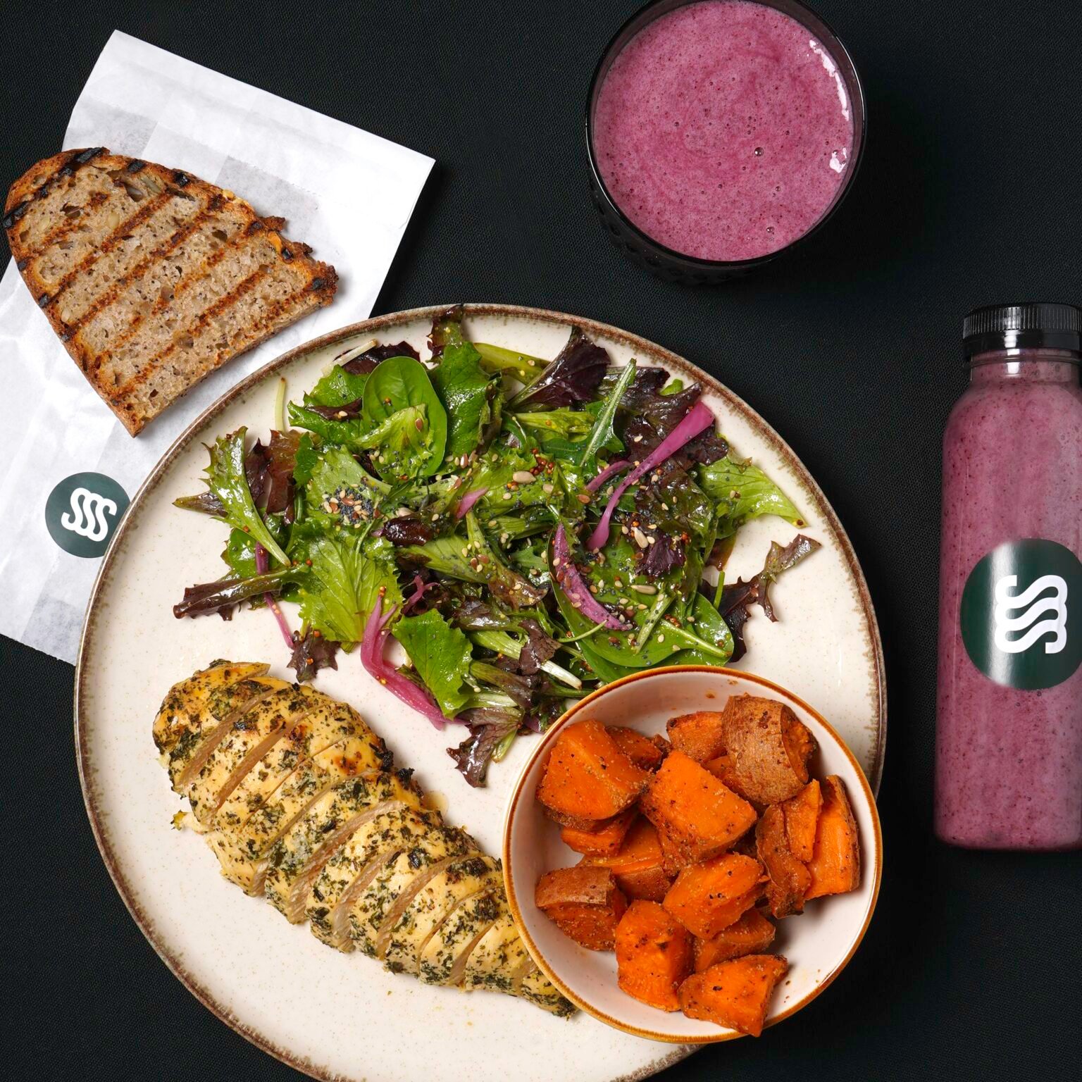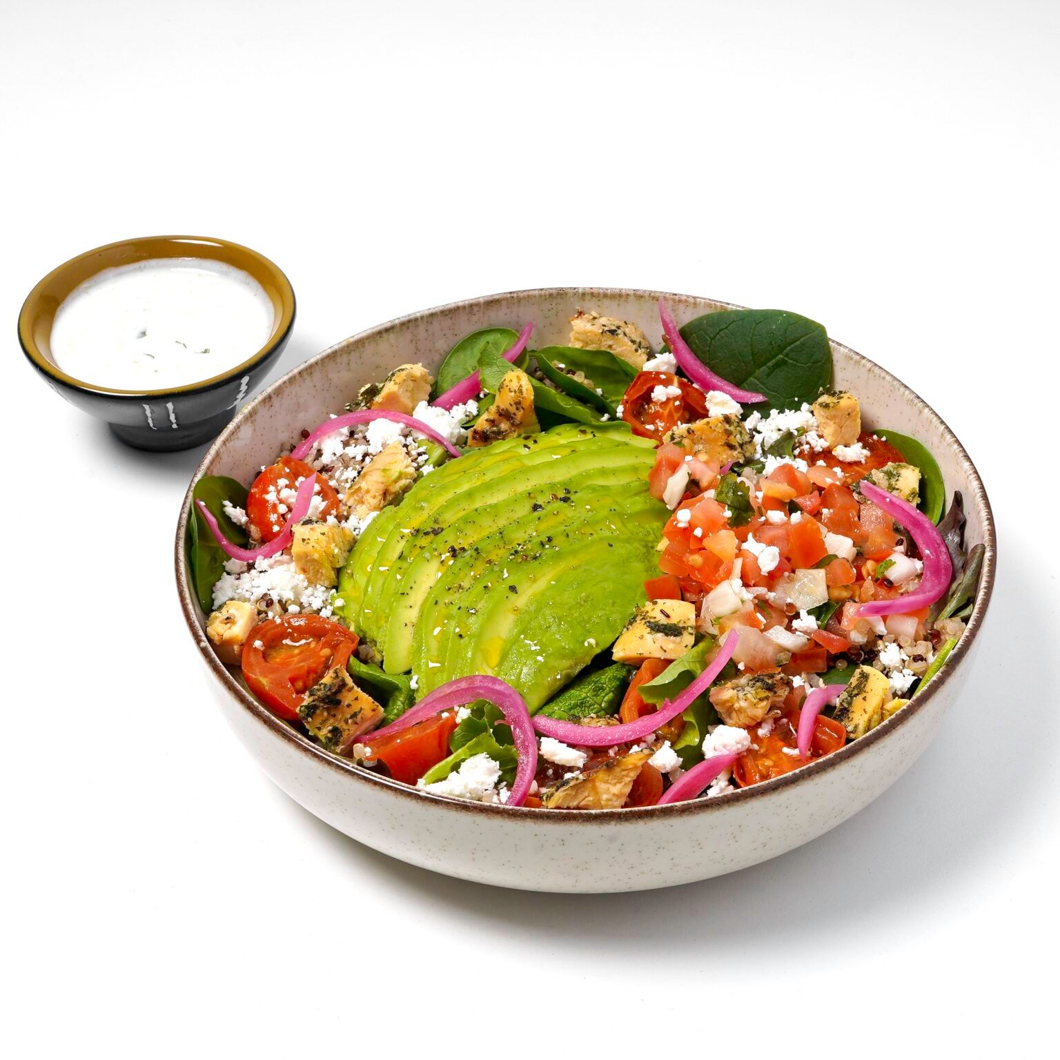 Mix de cinco brotes, quinoa tricolor, dados de pollo certificado horneado a las finas hierbas, aguacate, pico de gallo, queso feta, cebolla encurtida y aderezo de salsa de kéfir Habituals.