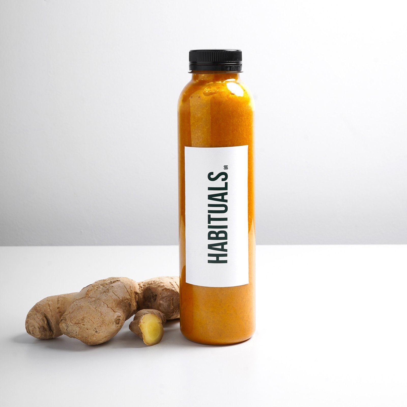 Zumo de manzana, zanahoria, jengibre, limón, cúrcuma y pimienta hecho al momento.