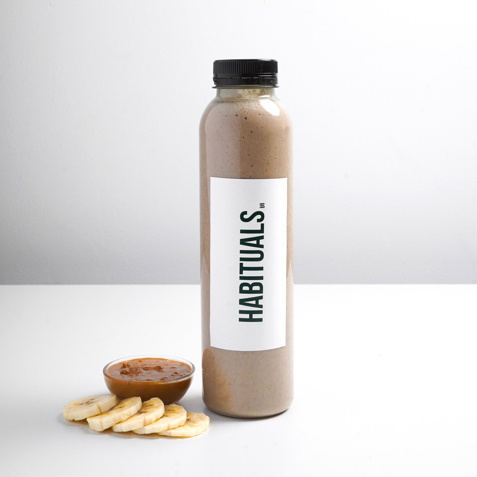 Batido de plátano, crema de cacahuete, copos de avena integral y canela. Con base de leche de avena. Hecho al momento.