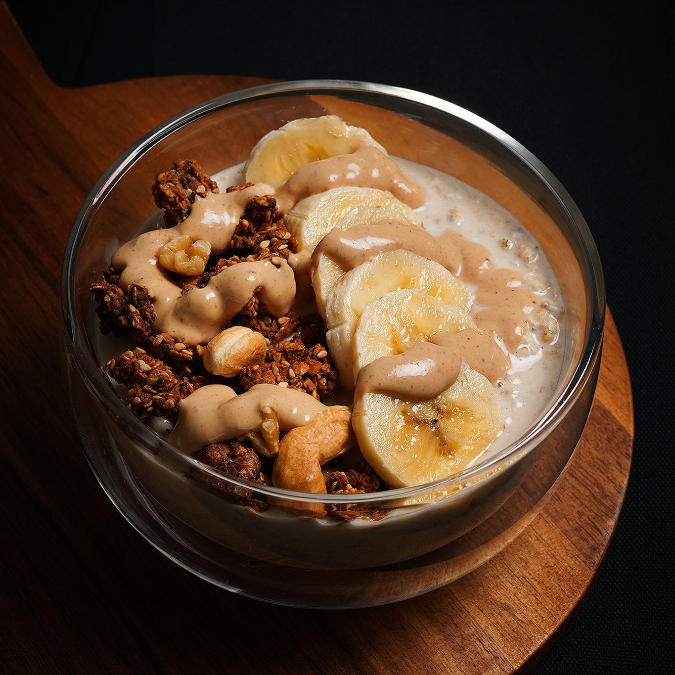 Copos de avena hidratados en leche de avena y coco con un toque de canela y toppings de plátano, granola Habituals (hecha con avena, chía, mix de semillas, anacardos, nueces y miel) y crema de cacahuete.